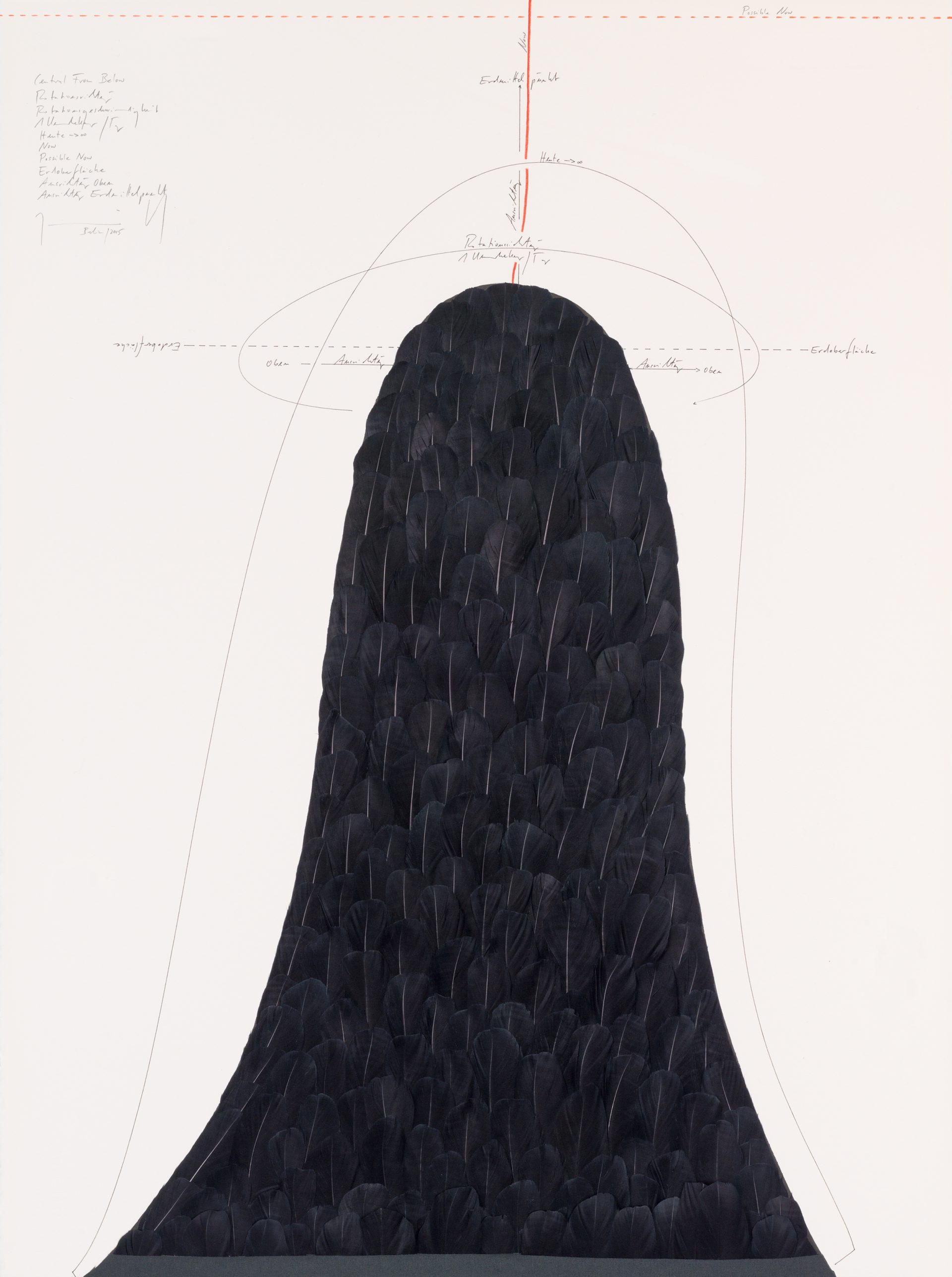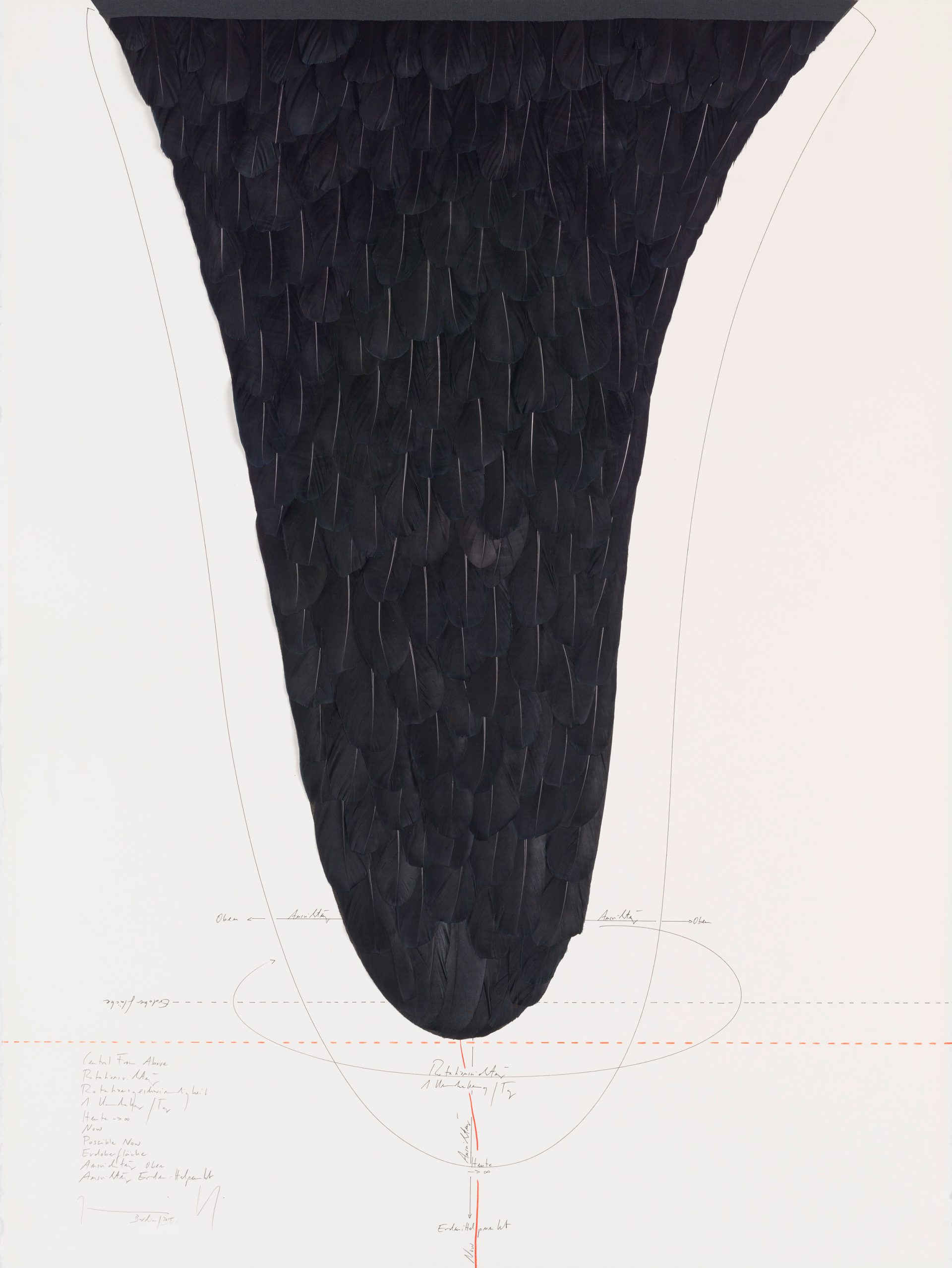 Ink, feathers, oil chalks, India ink, pencil on paper, unique, signed