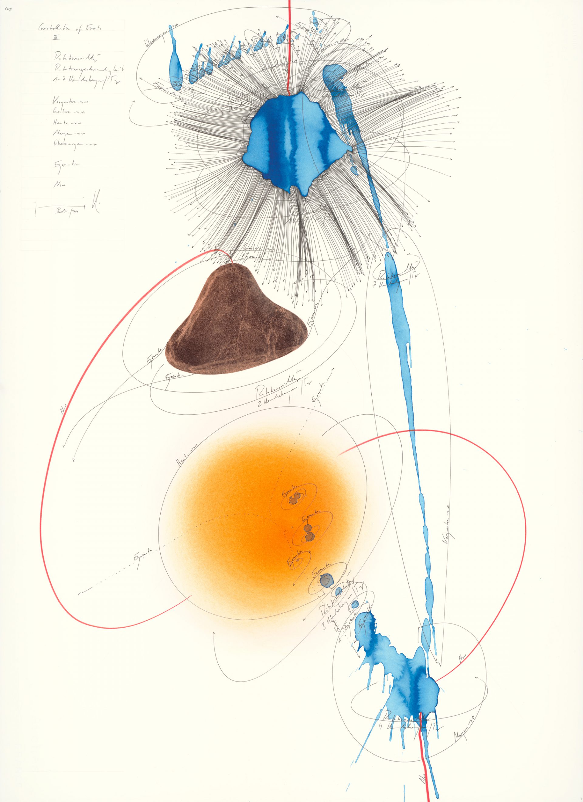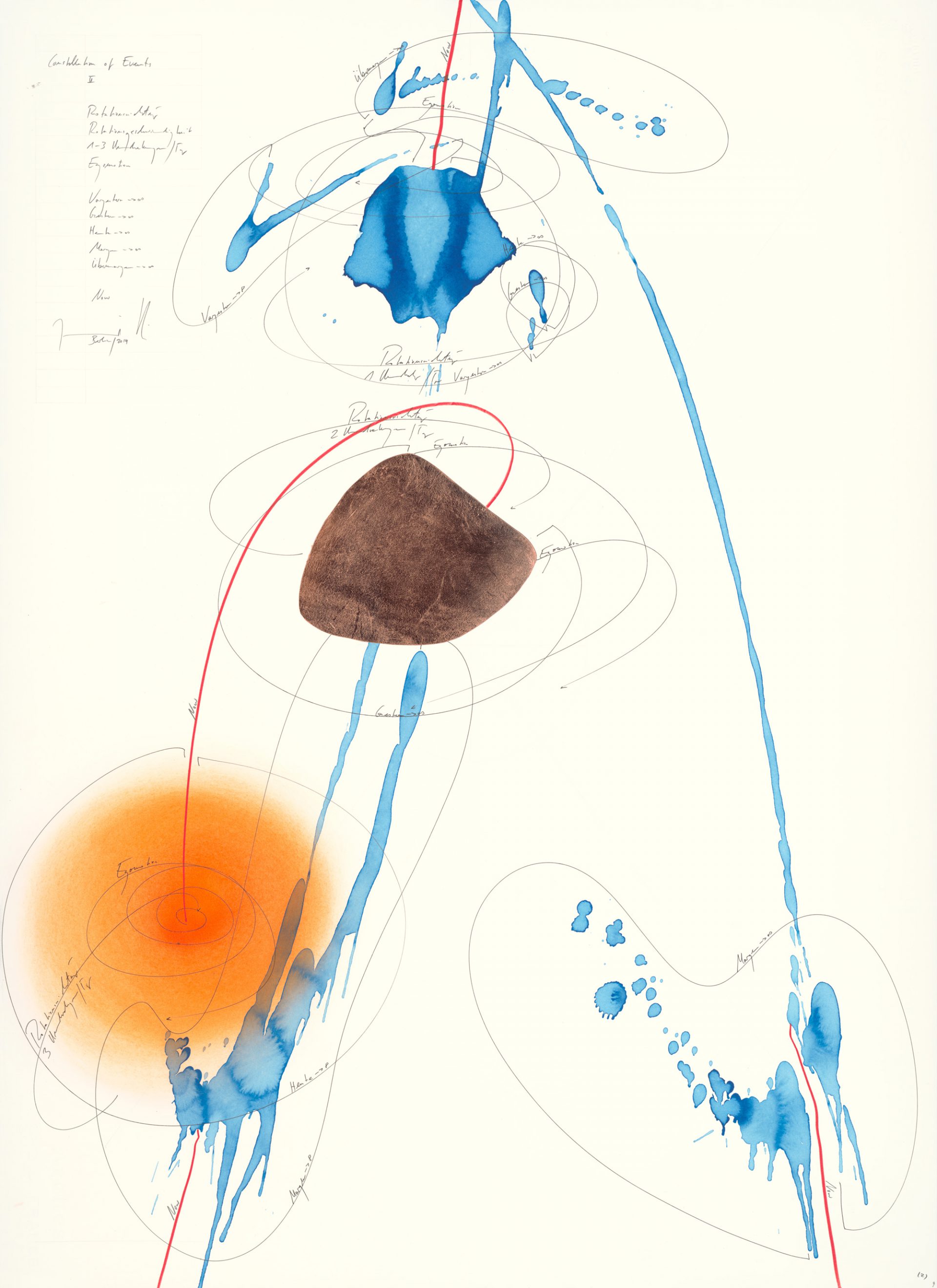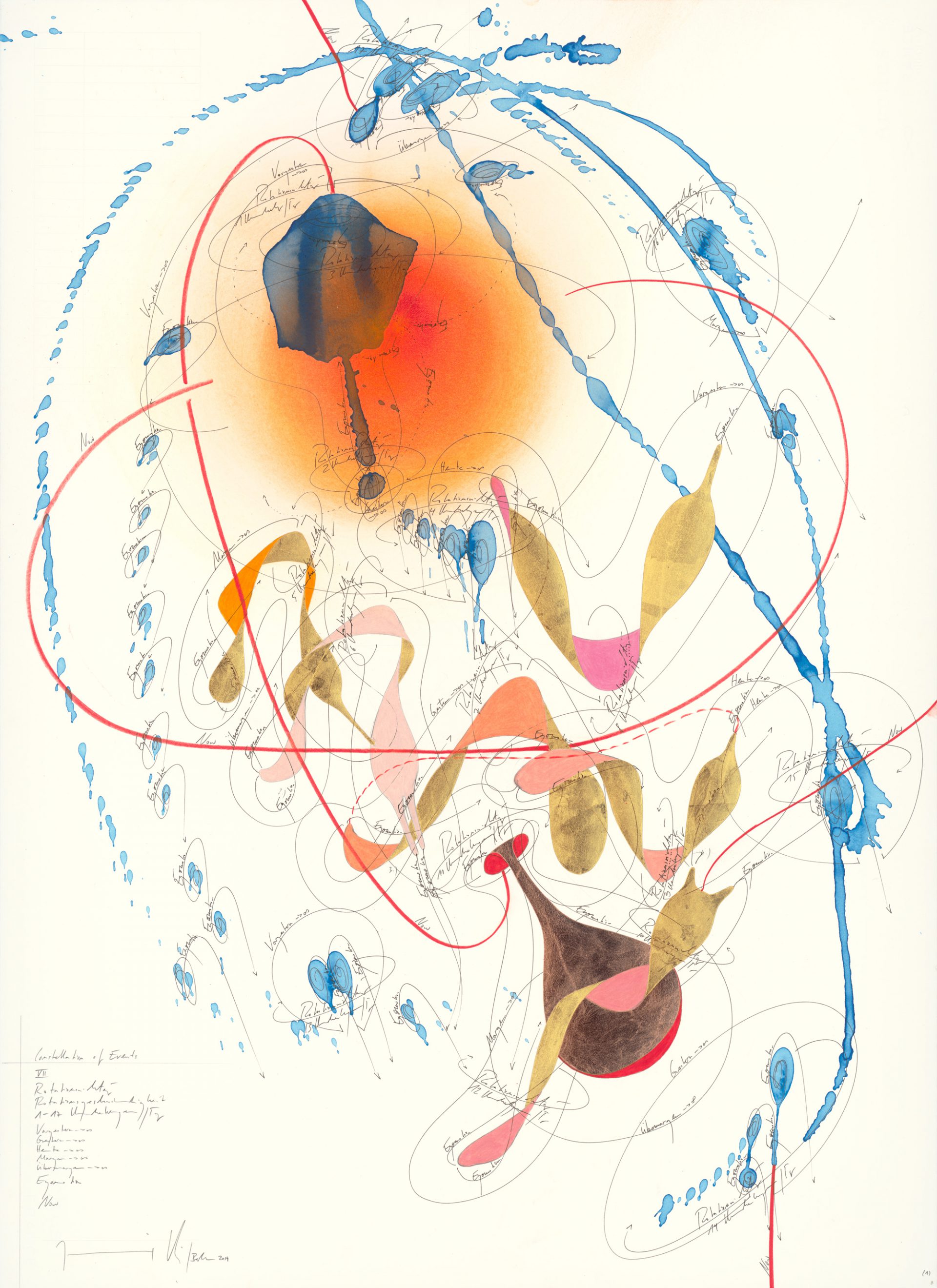 Ink, copper leaf, gold leaf, oil chalks, India ink, pastels, graphite on paper, unique, signed