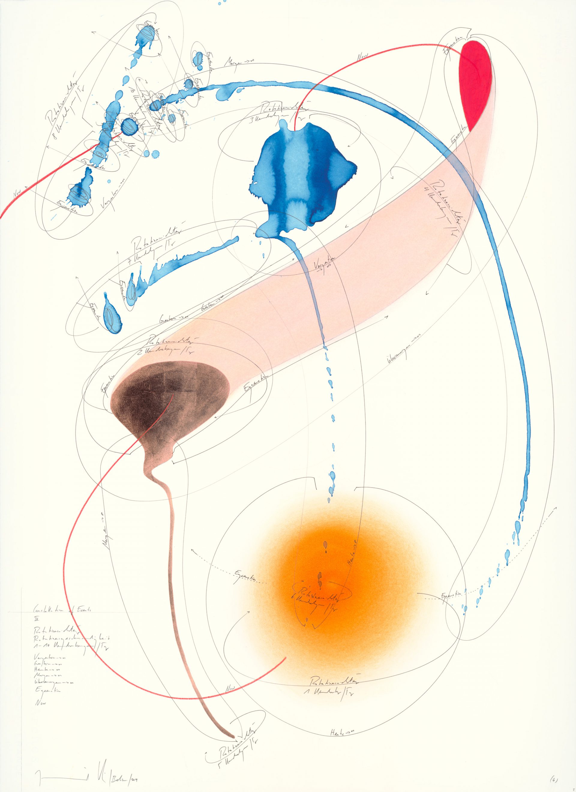 Ink, gold leaf, oil chalks, India ink, pastels, graphite on paper, unique, signed
