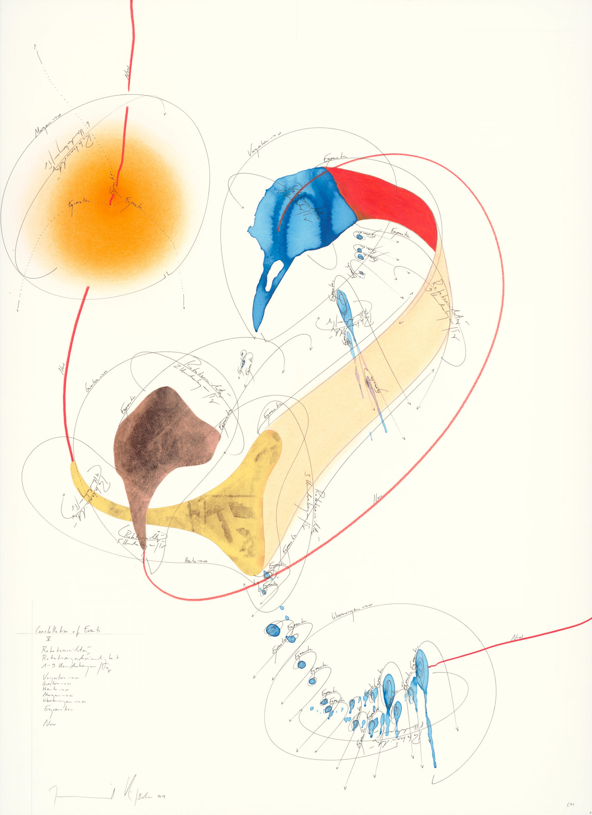 Ink, copper leaf, oil chalks, India ink, pastels, graphite on paper, unique, signed