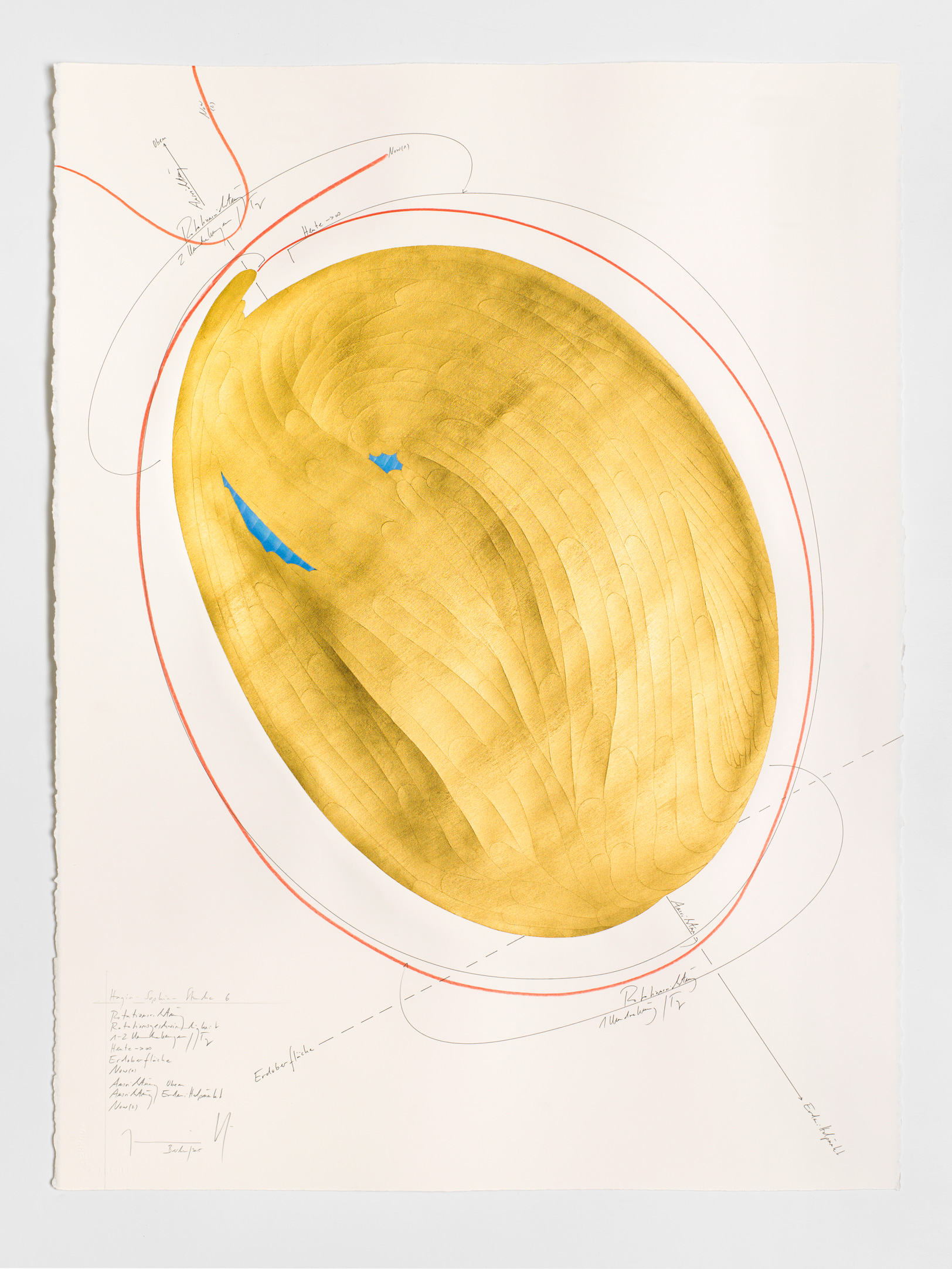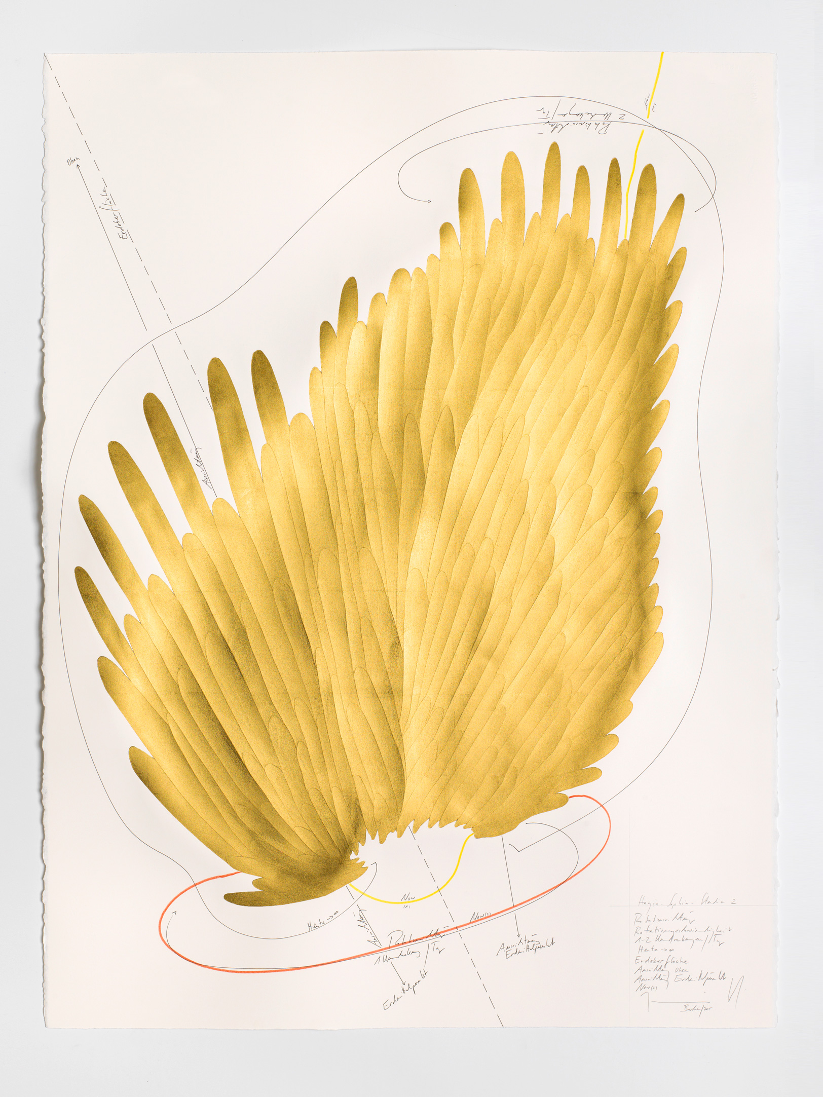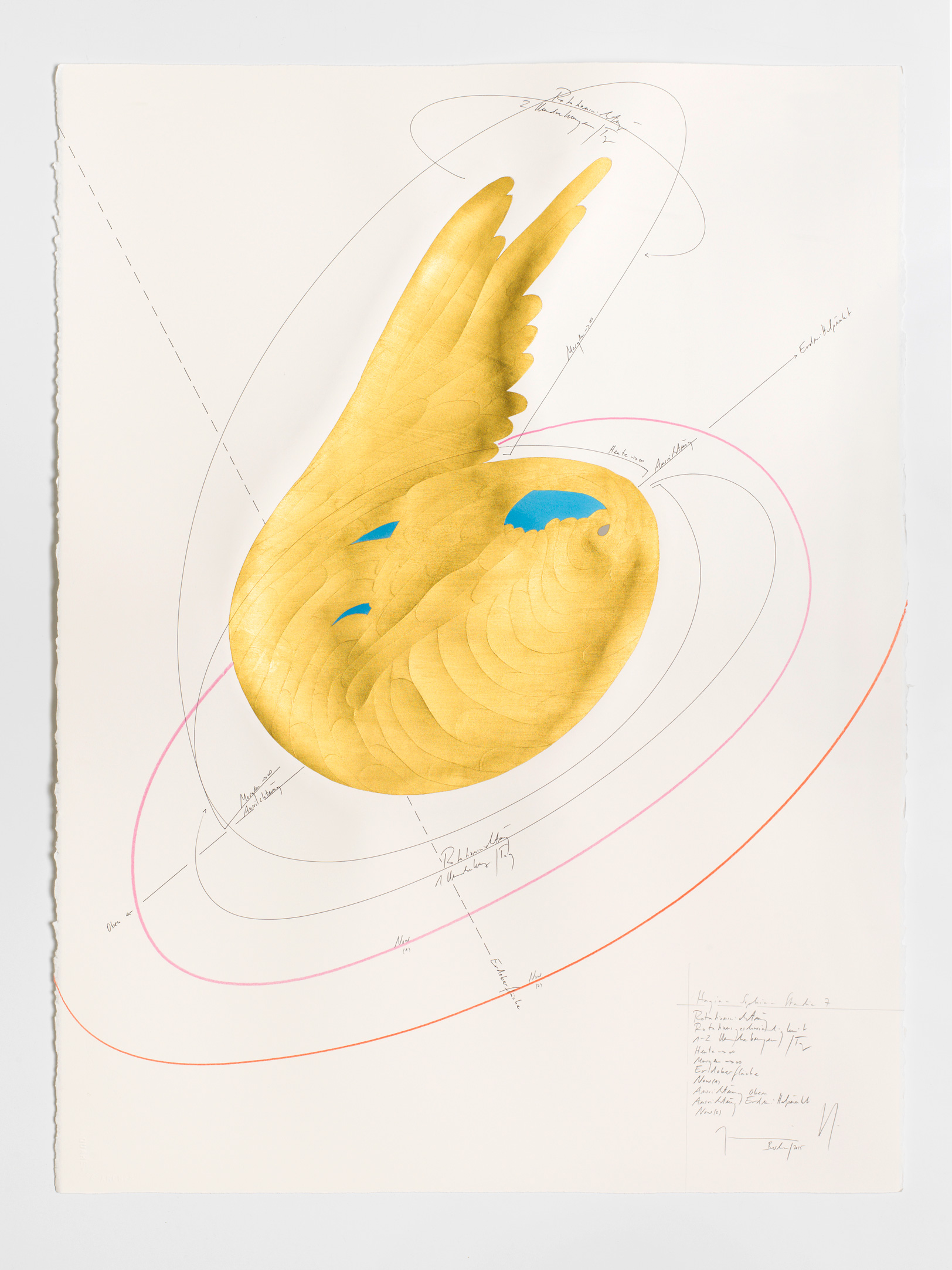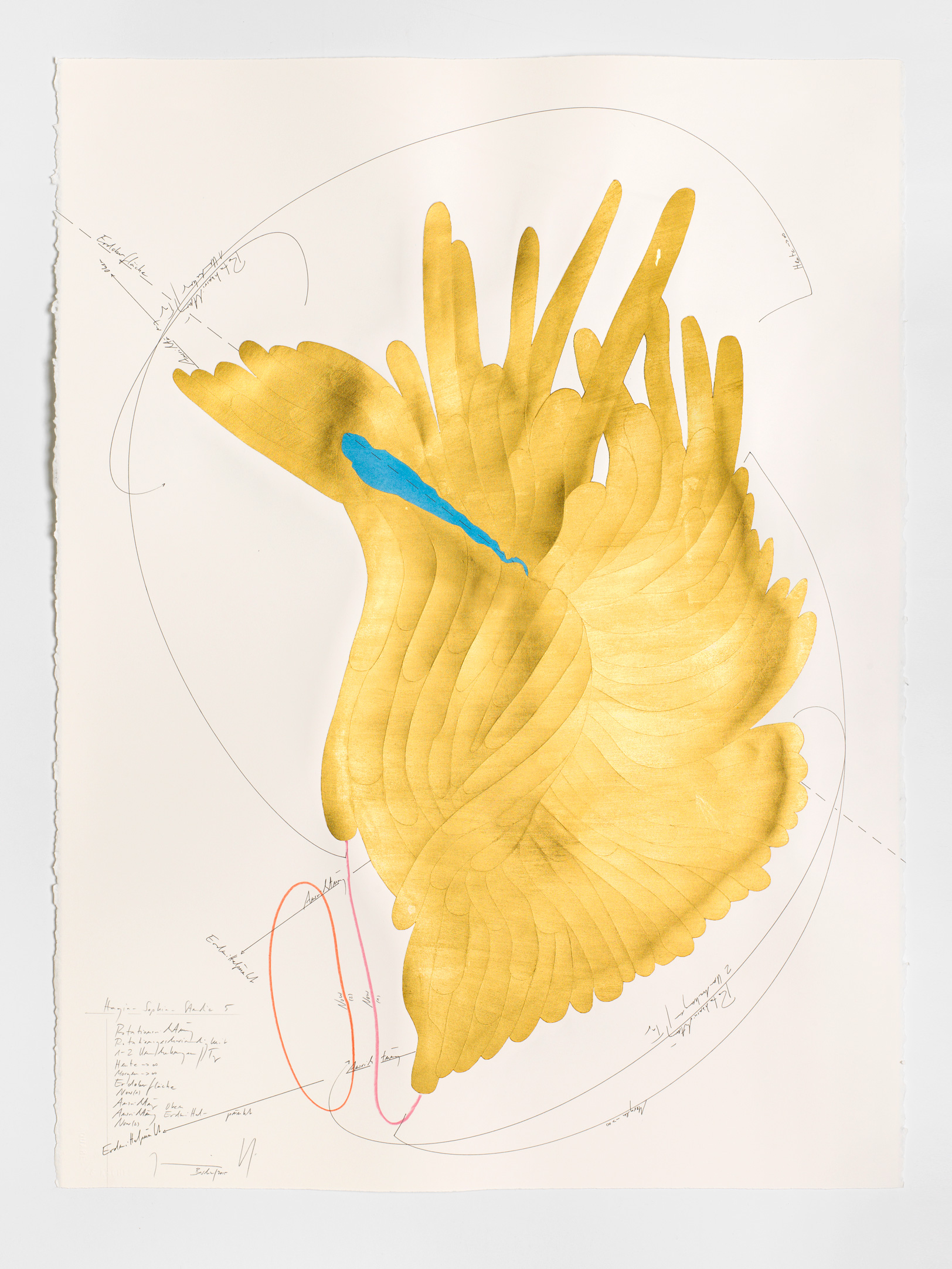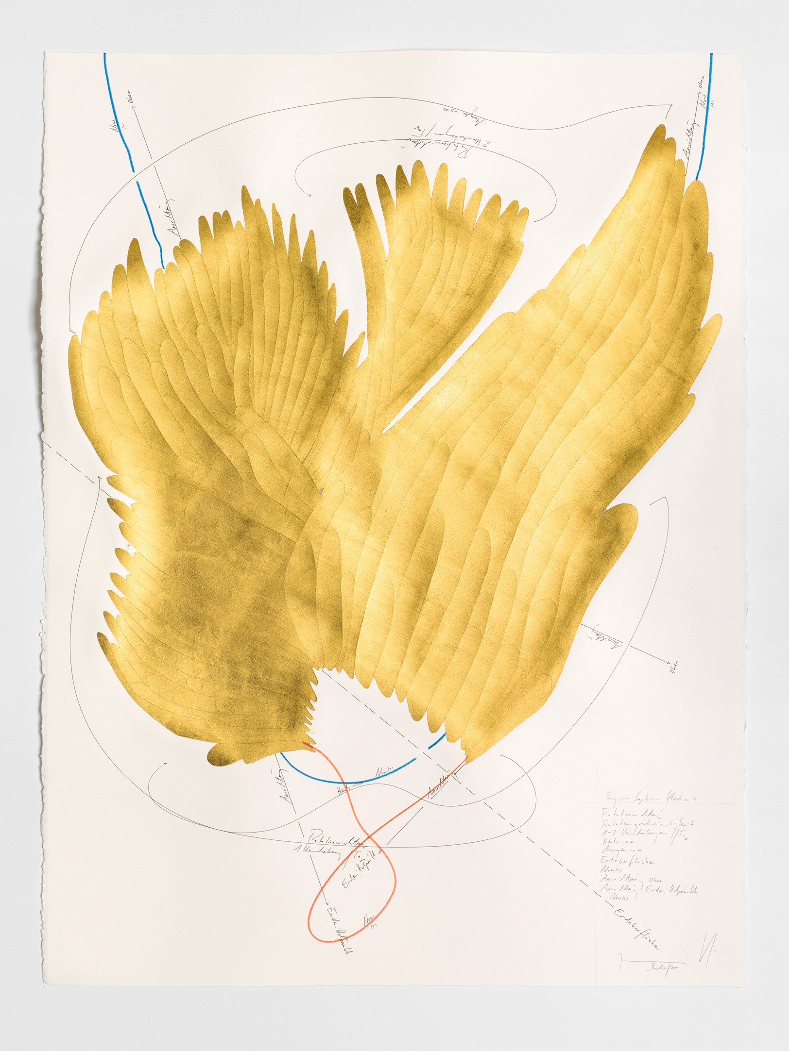 Ink, oil chalks, gold leaf, pencil on paper, unique, signed
